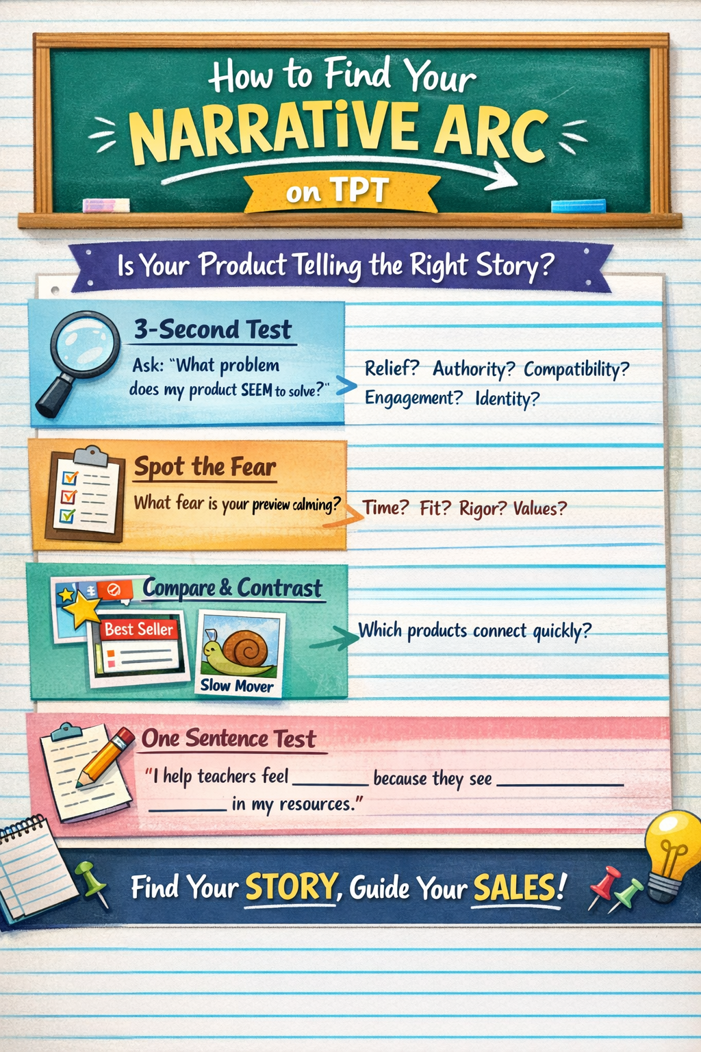 What I needed was a clear understanding of my narrative arc as a marketing tool to design the path for both my page view images and my preview images. This is important because narrative arc is like a little story that shapes how teachers interpret your product at a glance. The narrative arc gives your page view images and preview a marketing purpose, direction, and strategy. On TPT, every product already tells a story. The story your resouce tells should depend on what your buyers want. Sellers who can diagnose that narrative arc evolve their page views and previews into powerful, persuasive marketing tools — and that changes everything.
