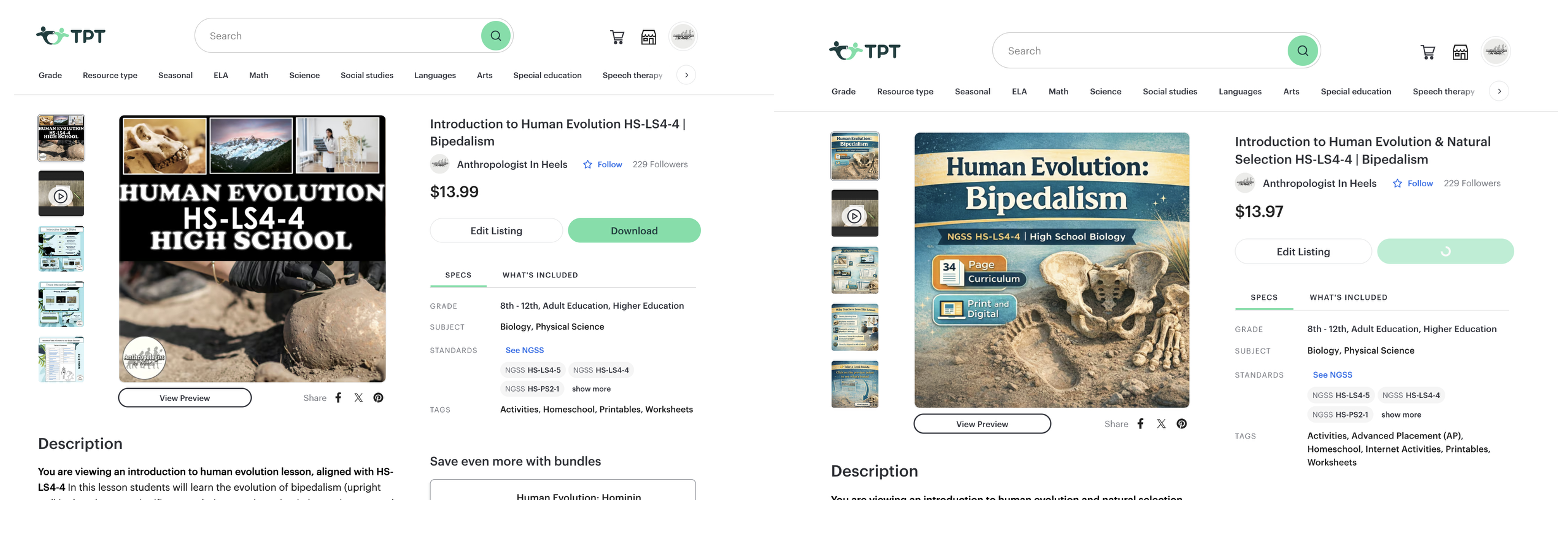 When you look at the image on the left, it’s immediately clear that it’s older and doesn’t stop the scroll—it blends in instead of standing out. The changes my AI model made are obvious when you compare it to the image on the right. The title is instantly readable at thumbnail size, the product identity is clear, and the value is communicated visually before a buyer reads a single word of the description. Rather than forcing the viewer to think or hunt for information, the pageview answers key questions right away: what the resource is, who it’s for, what’s included, and why it’s worth clicking. The visual hierarchy guides the eye naturally, the icons support fast scanning, and the layout subtly directs attention toward the preview button—something the left image never accomplishes. This is the difference between a pageview that simply exists and one that actively converts. The AI didn’t make the design flashier; it made it clearer—and clarity is what turns views into sales.